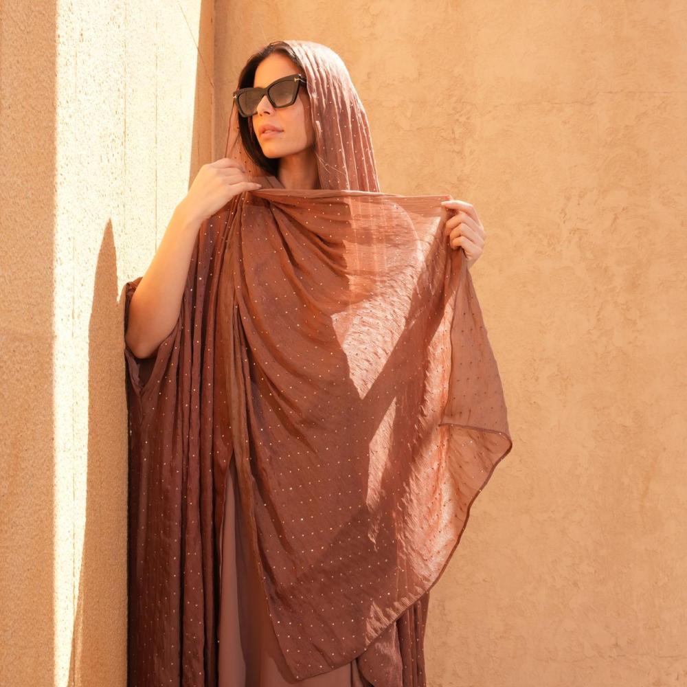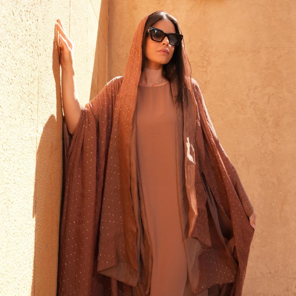 عباية شيفون مبطنة بلون ترابي دافئ، تصميمها يجمع بين البساطة والرقي