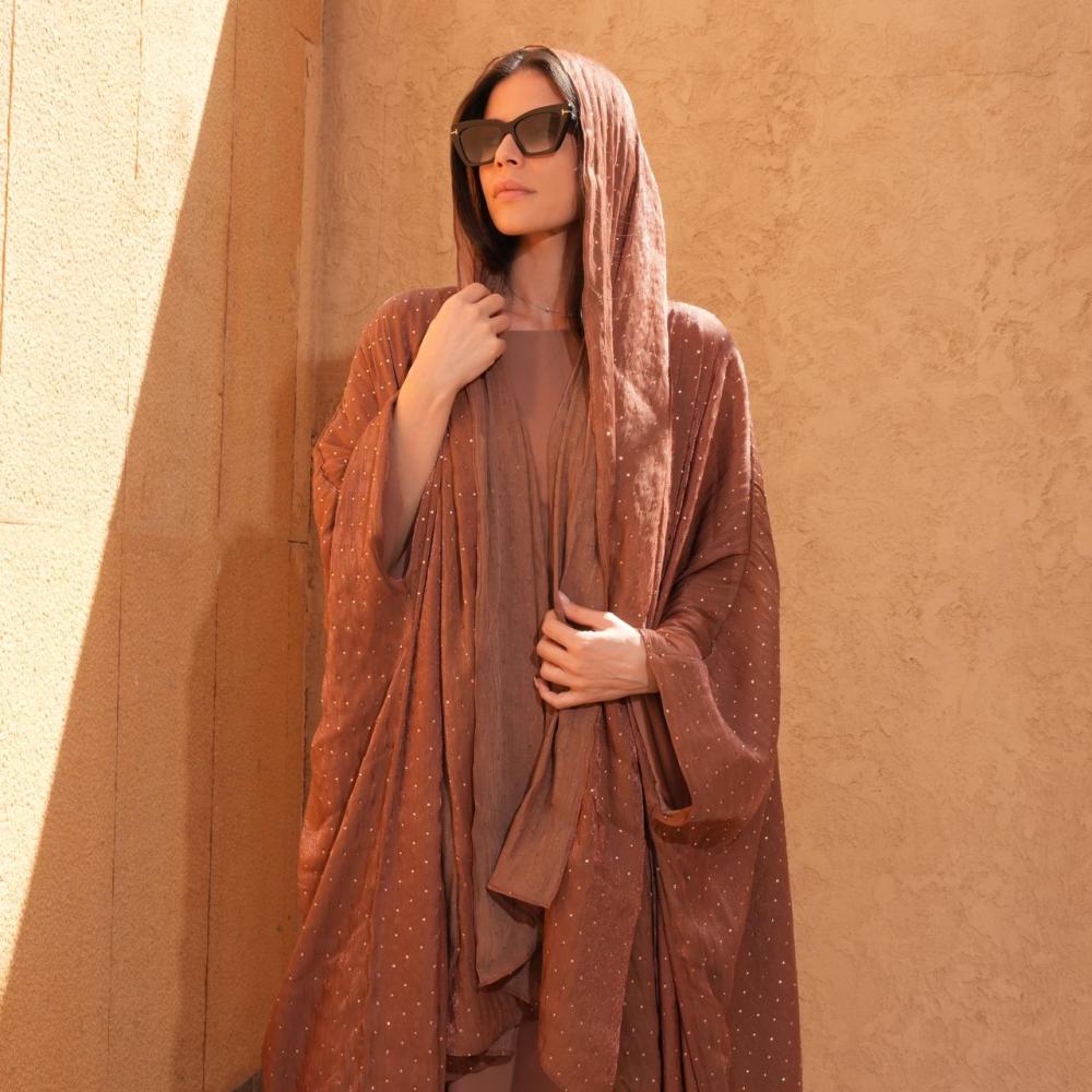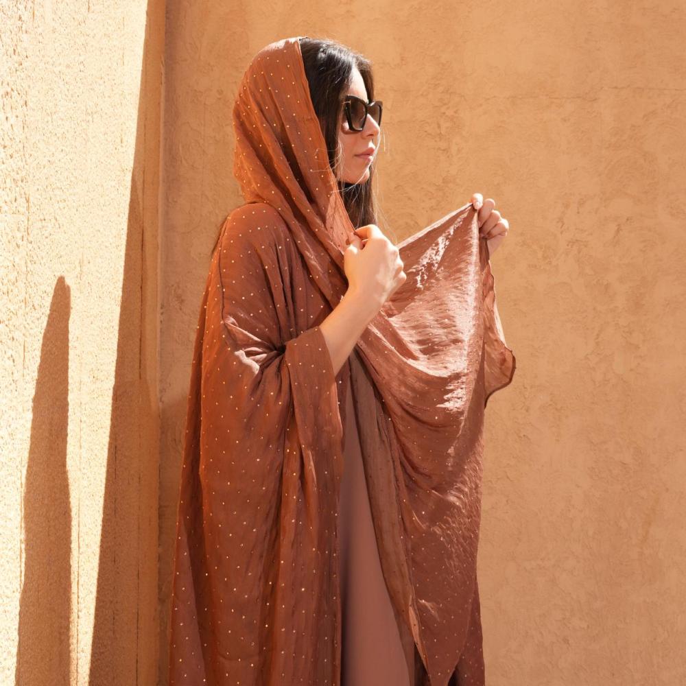 - العباية مزينة بنقاط ذهبية صغيرة تضيف لمعة ناعمة تحت ضوء الشمس، وتبرز جمال التصميم بدون مبالغة.